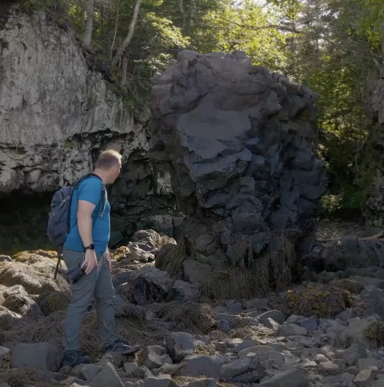 A climb down a cliffside in search of gemstones along the Bay of Fundy leads to a rocky beach, a waterfall, and much more. On the other side of the cape, a trip through the forest leads to a hidden monument and sea caves.